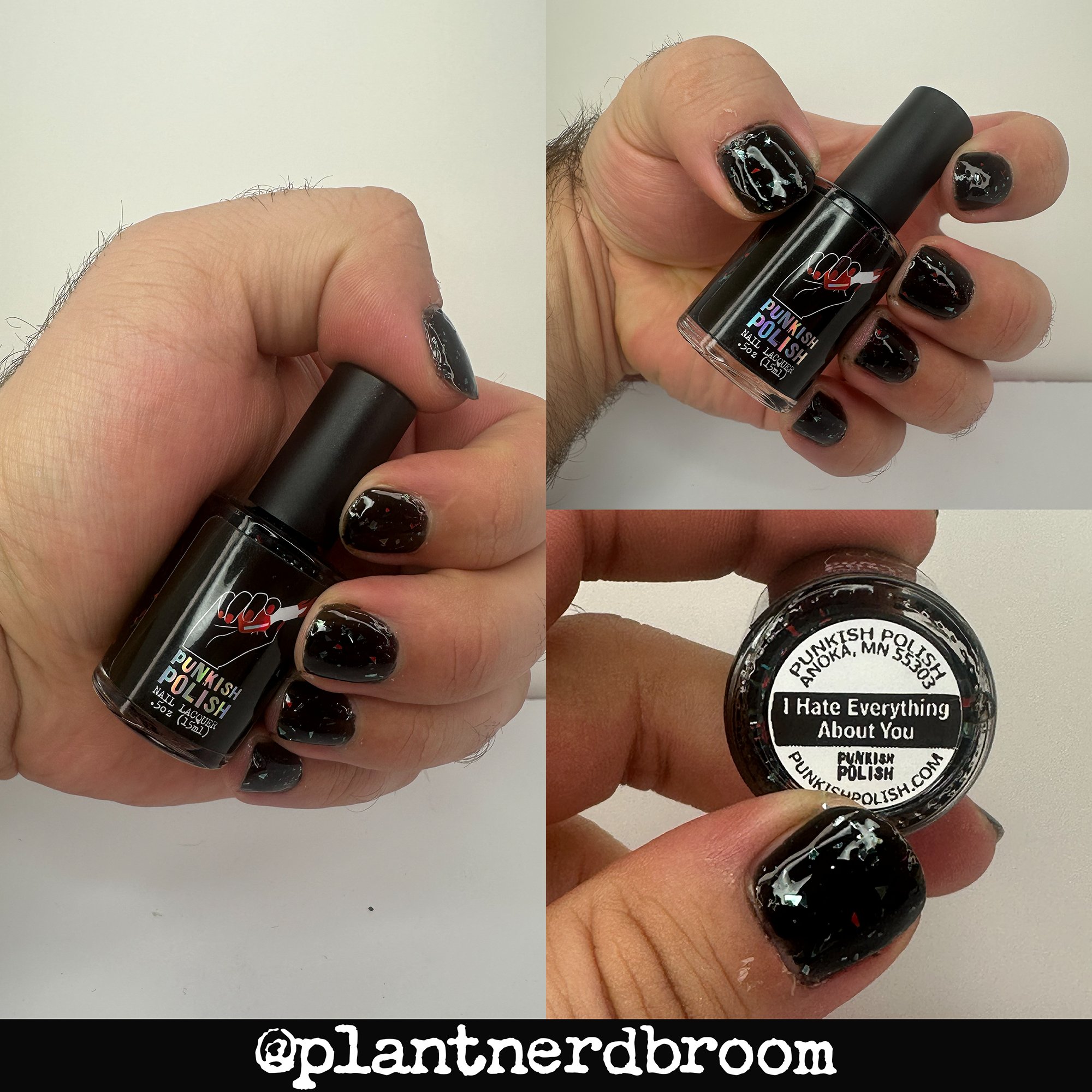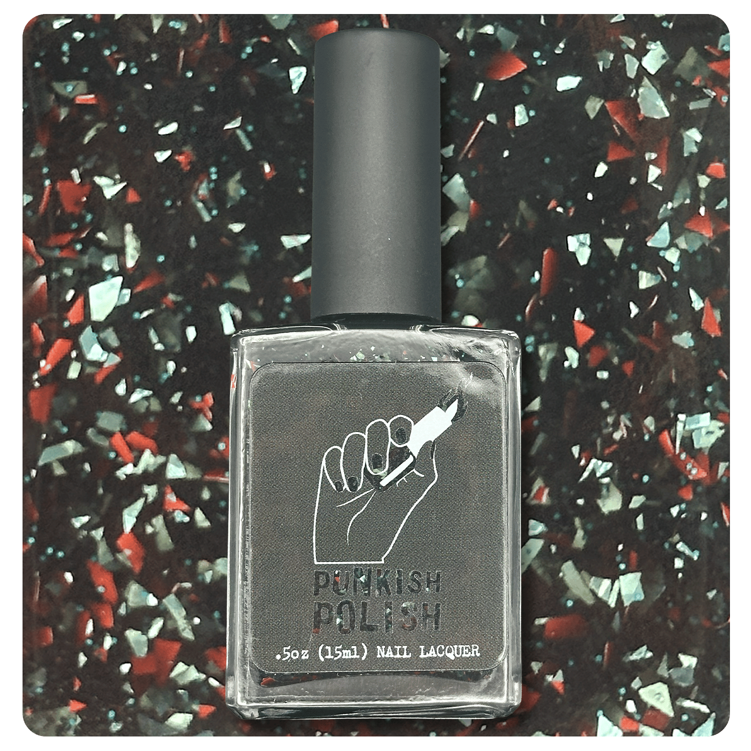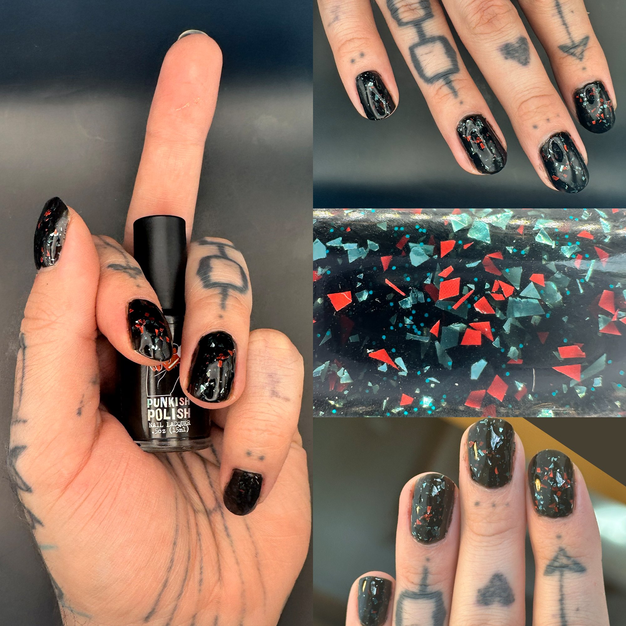 I Hate Everything About You is a sheer black base with matte red and metallic cyan flakes, plus microfine turquoise glitter mixed throughout.