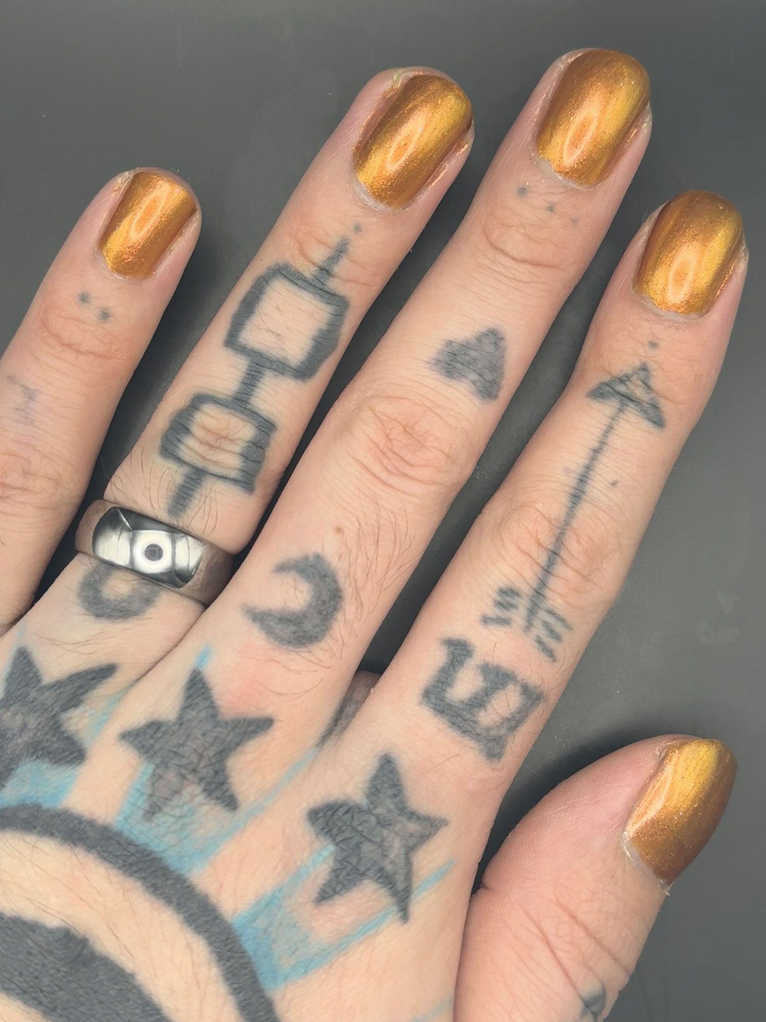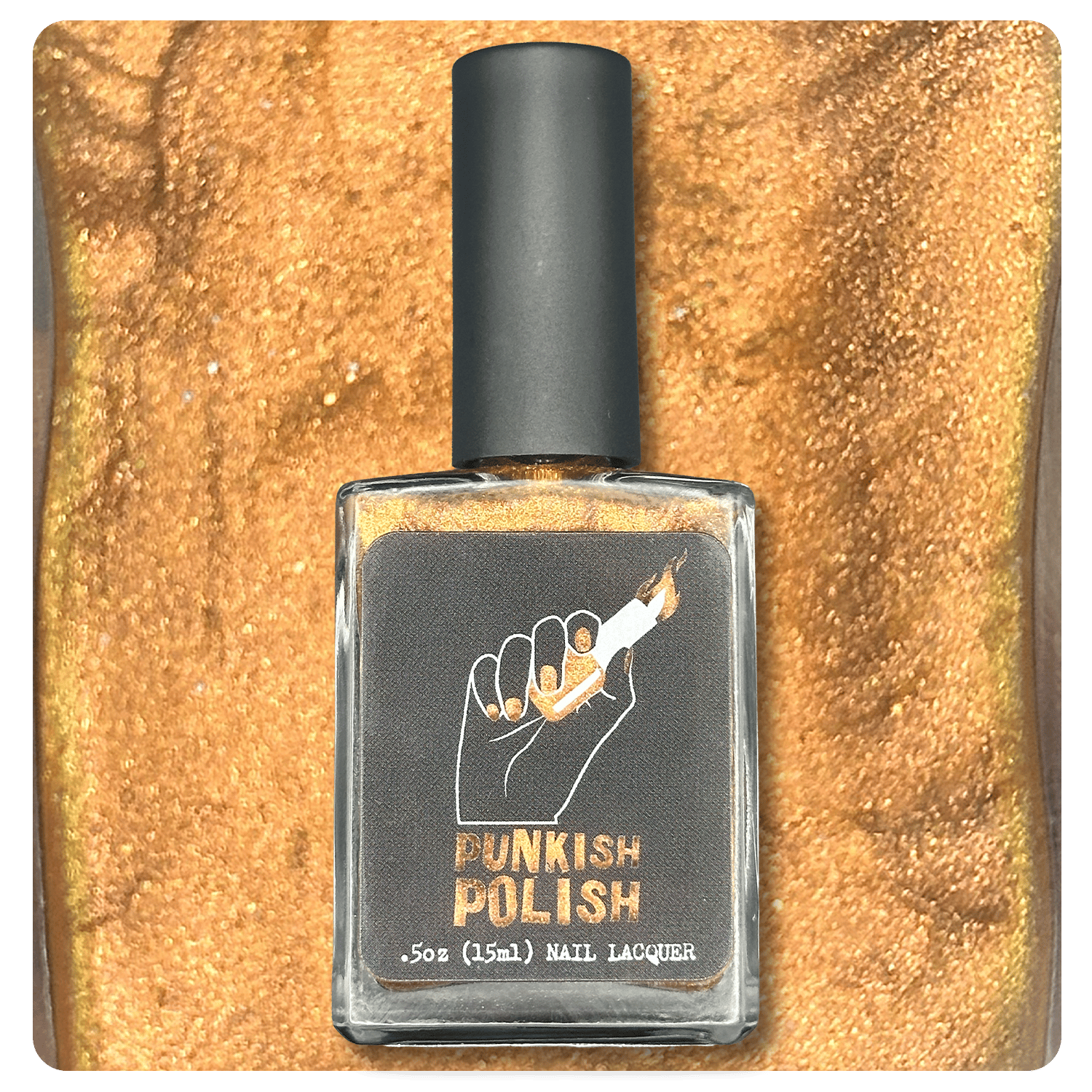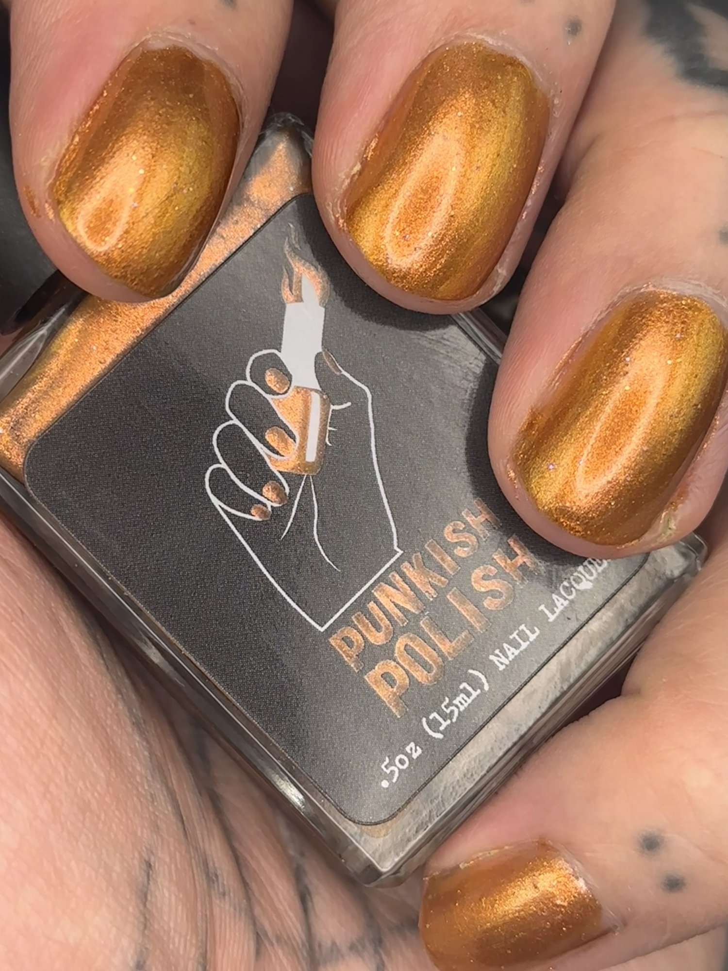 An amber creme that shifts between golden yellow and burnt orange depending on the light. Subtle reflective glitter mixed throughout.