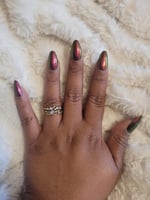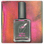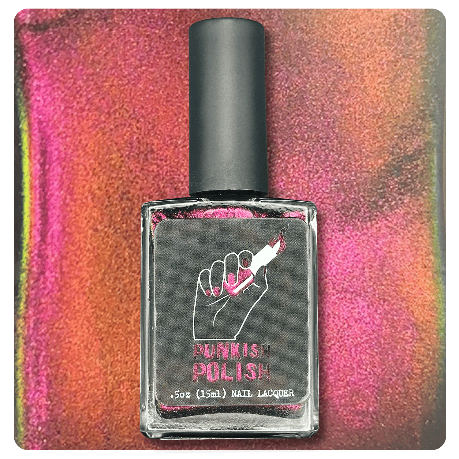 Complicated is a multichrome that shifts between pink, red, orange, yellow, green, and blue depending on the light.