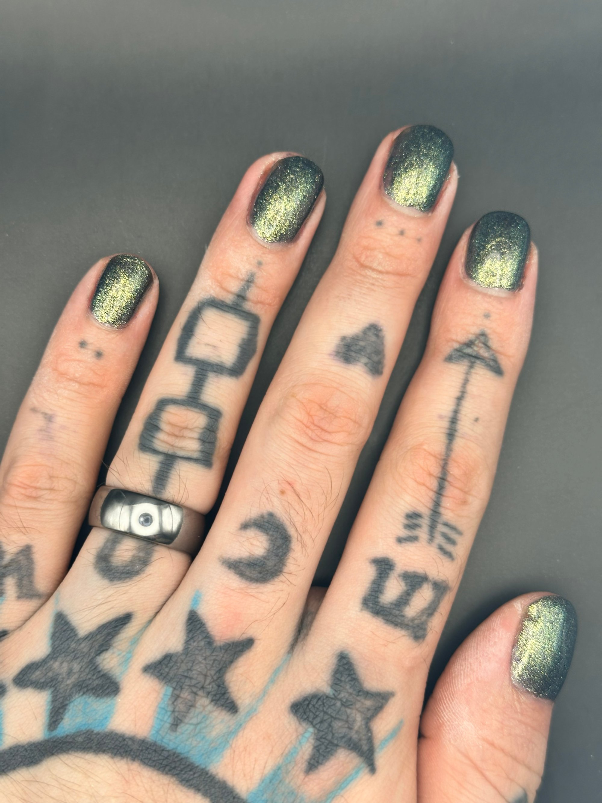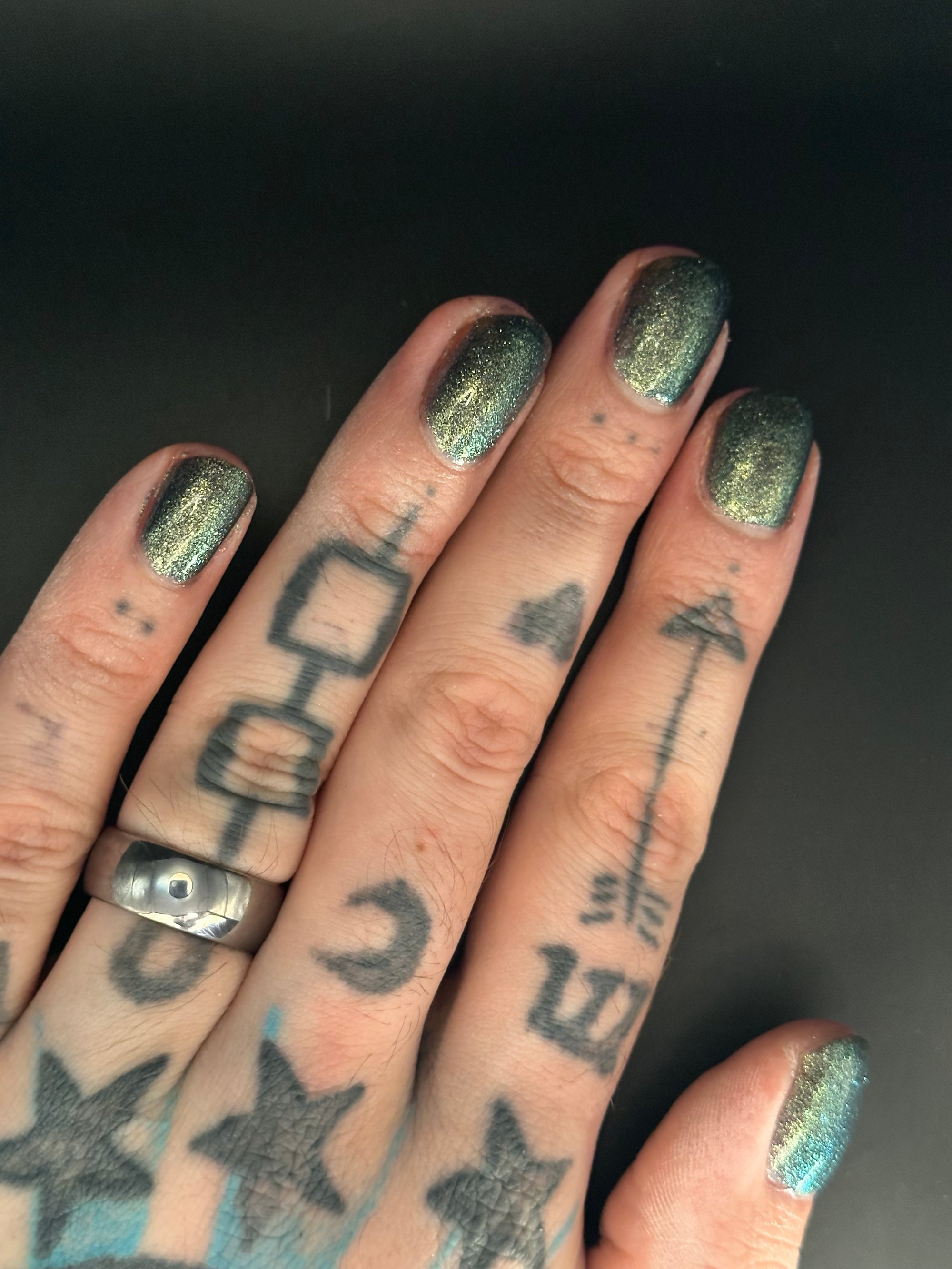 Thin Ice is a glittery shimmer polish that shifts between blue, green, and yellow depending on the light.